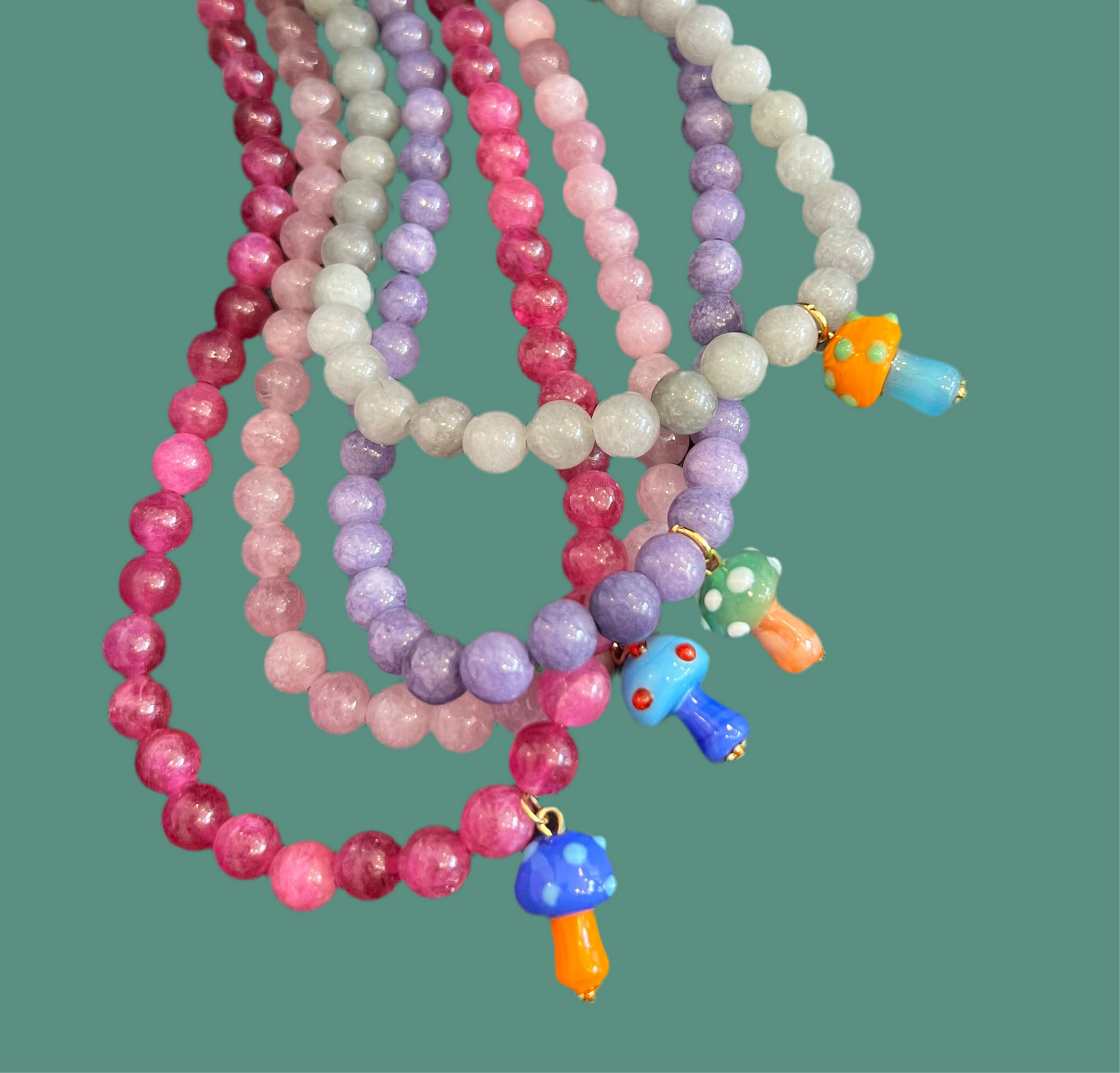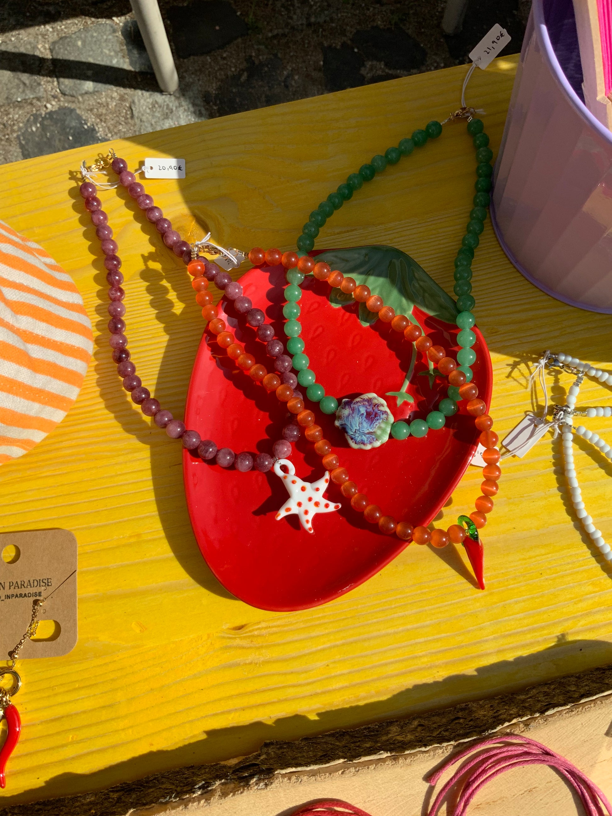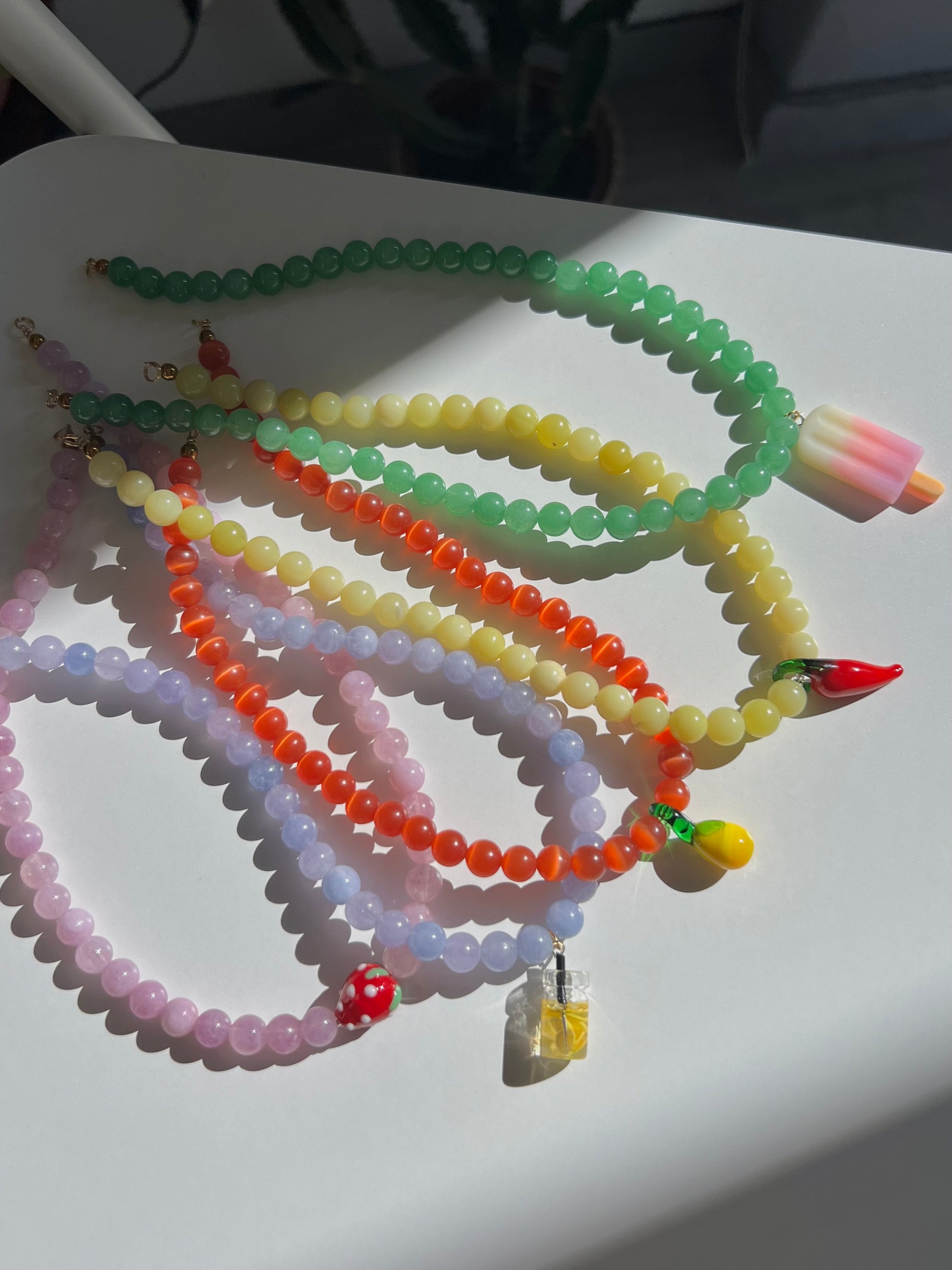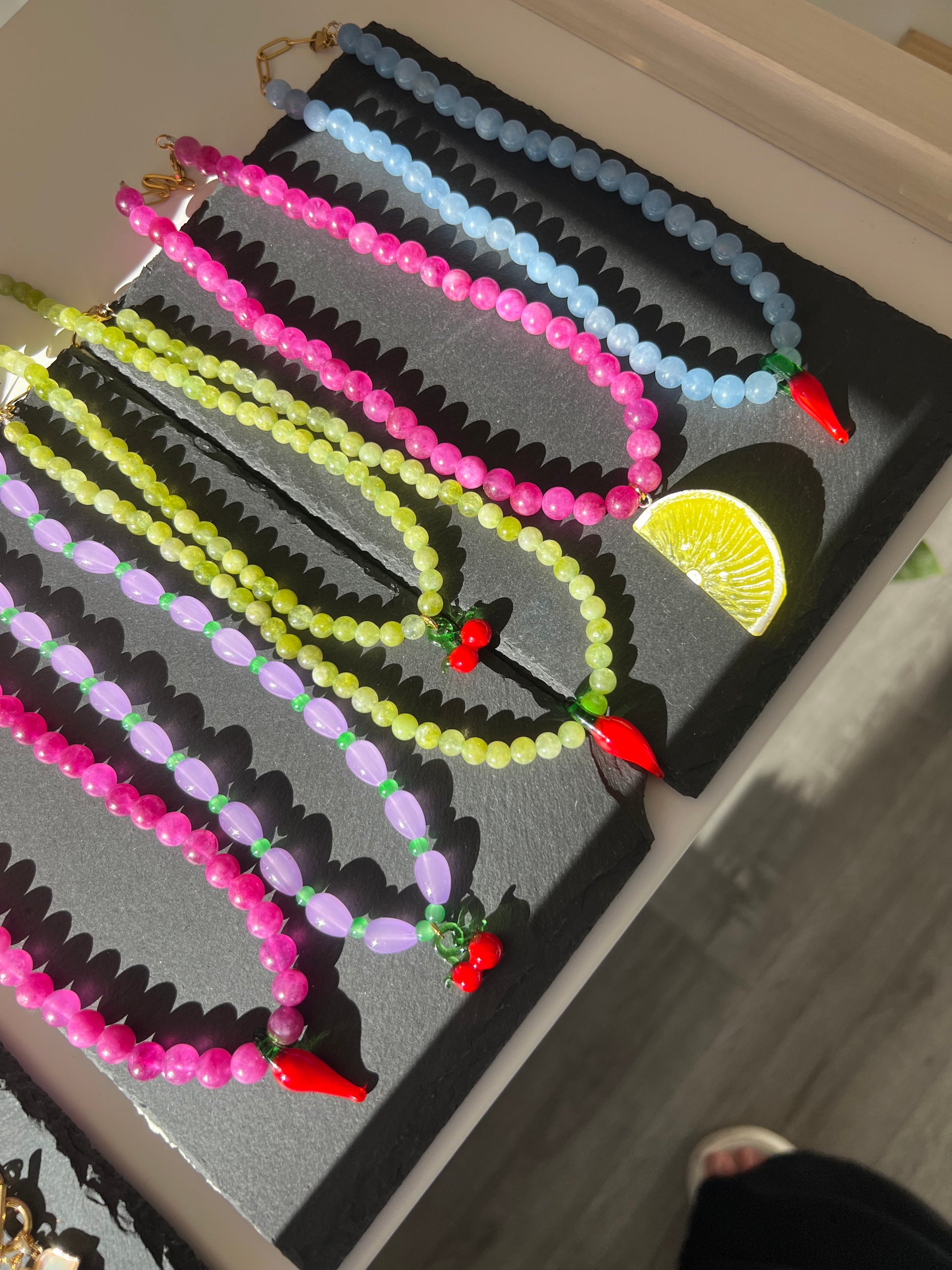Cada Boogie Necklace é uma peça única, criada à mão com pedras semi-preciosas cuidadosamente escolhidas e com pendentes em vidro ou resina, que refletem diversão e a tua personalidade.