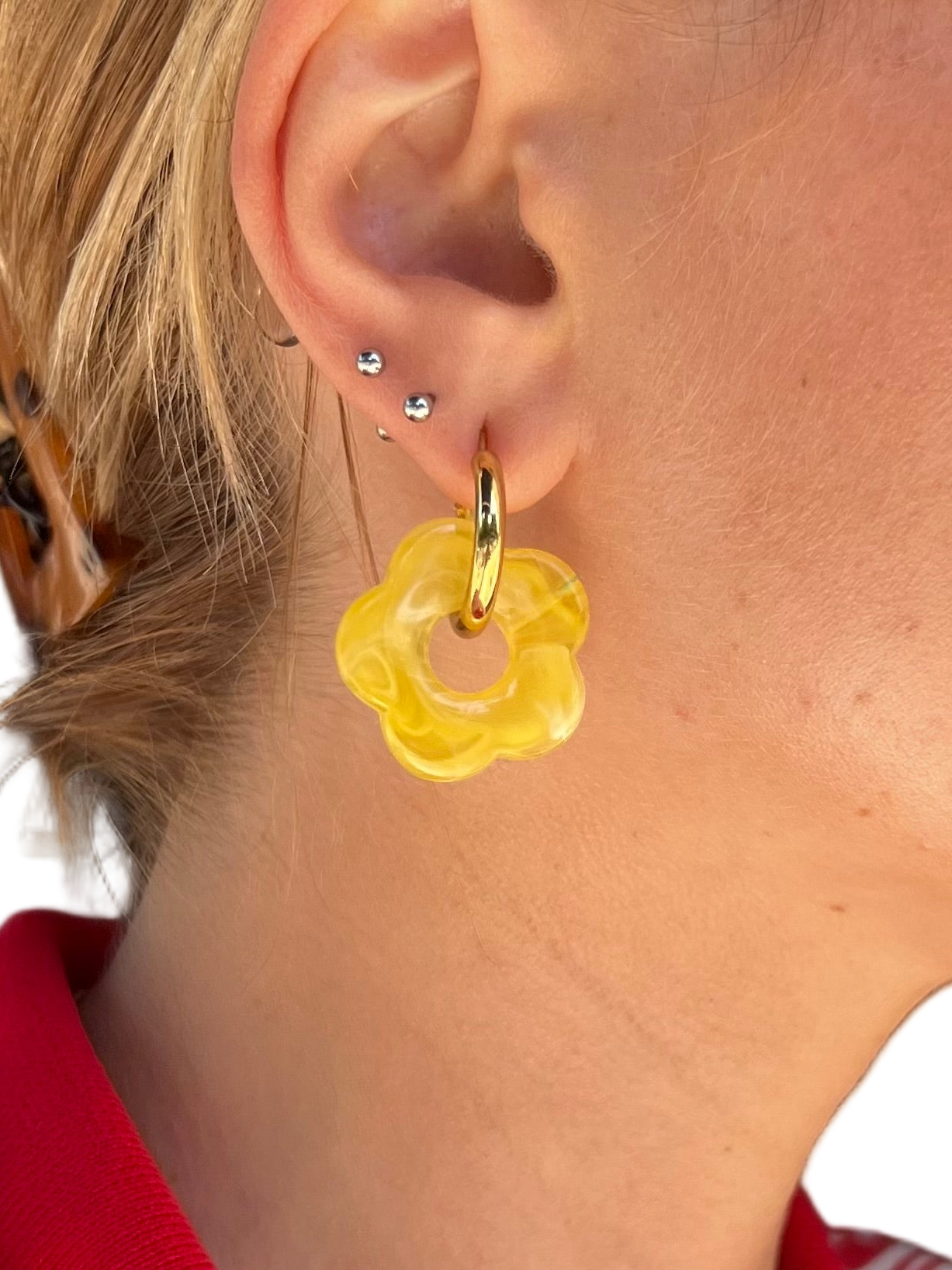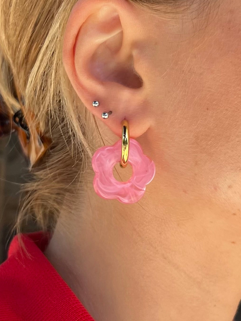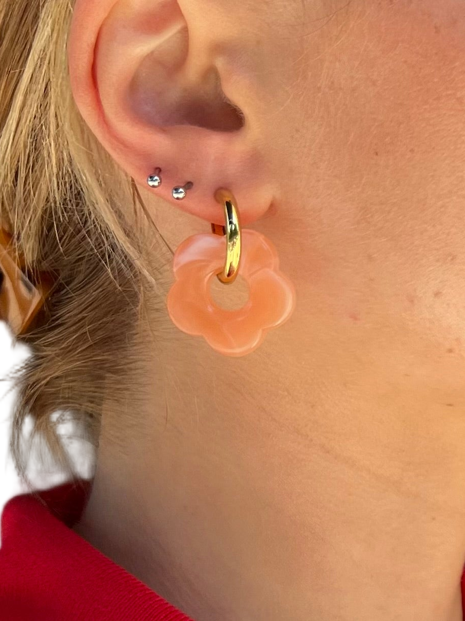 Se gostas da ideia de criar combinações, mas preferes não pensar muito, este modelo já vem pronto: uma argola + um pendente em forma de flor (e ainda podes escolher a cor!). É uma peça leve, divertida e super fácil de usar, ideal para usar sozinha ou misturar com outras no segundo furo. Argolas em aço inoxidável e pendente em resina. As flores são todas ligeiramente diferentes.