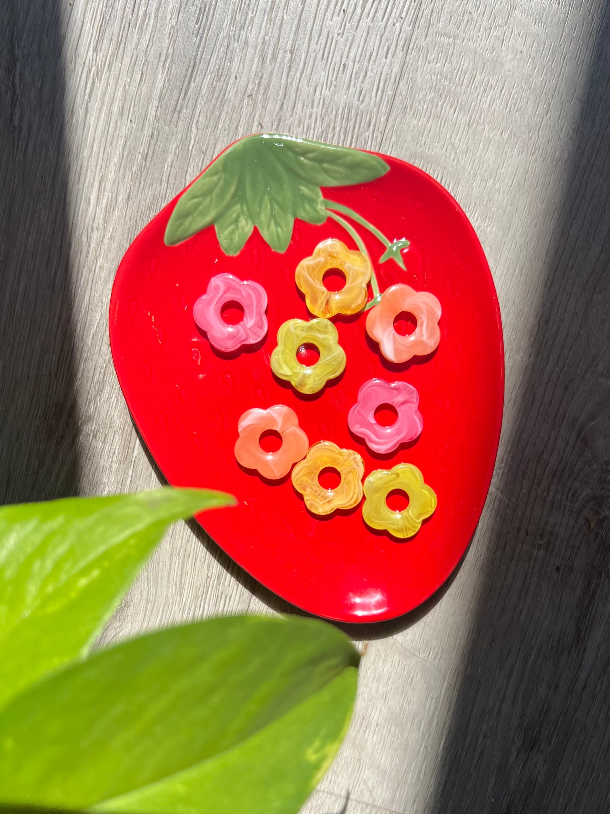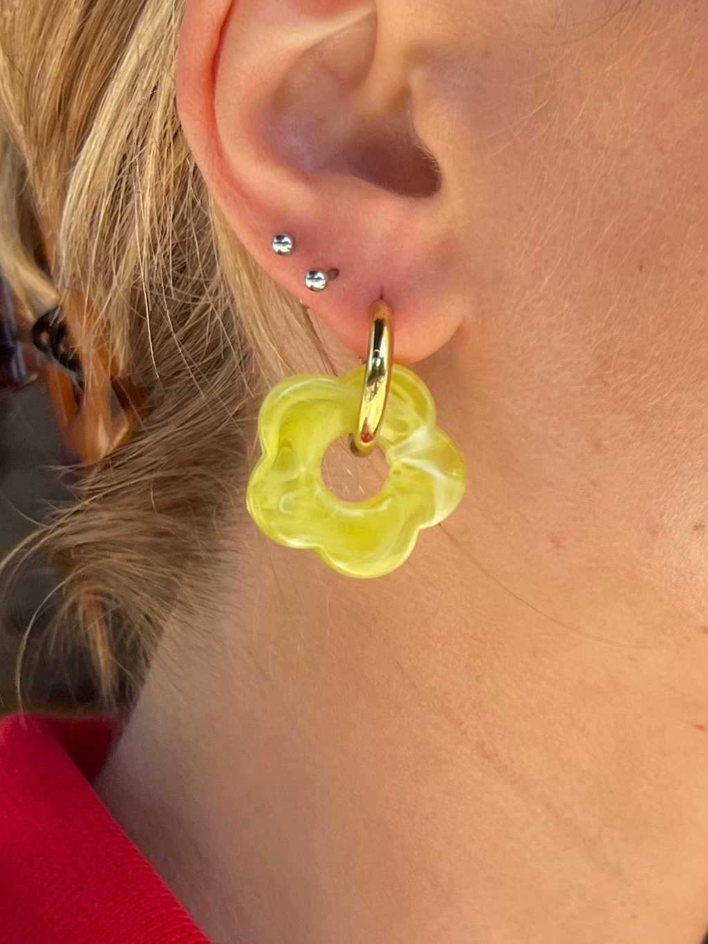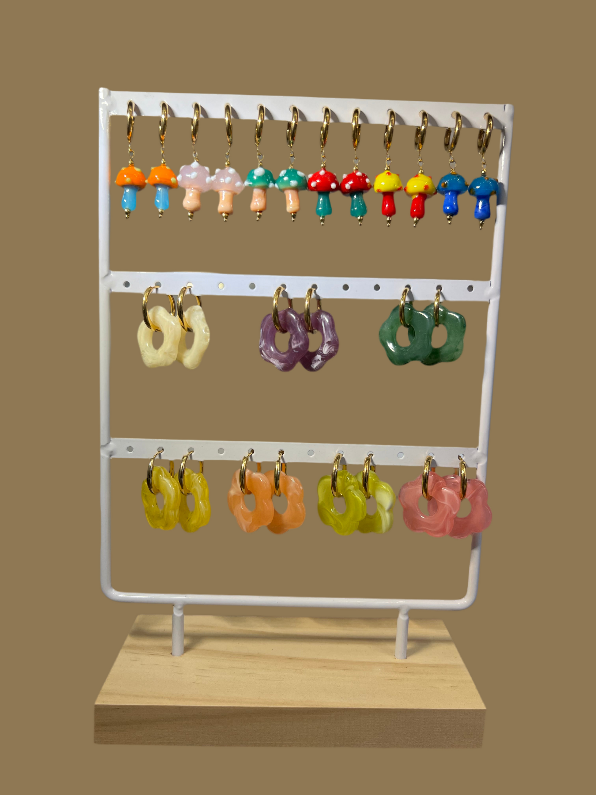 Se gostas da ideia de criar combinações, mas preferes não pensar muito, este modelo já vem pronto: uma argola + um pendente em forma de flor (e ainda podes escolher a cor!). É uma peça leve, divertida e super fácil de usar, ideal para usar sozinha ou misturar com outras no segundo furo. Argolas em aço inoxidável e pendente em resina. As flores são todas ligeiramente diferentes.