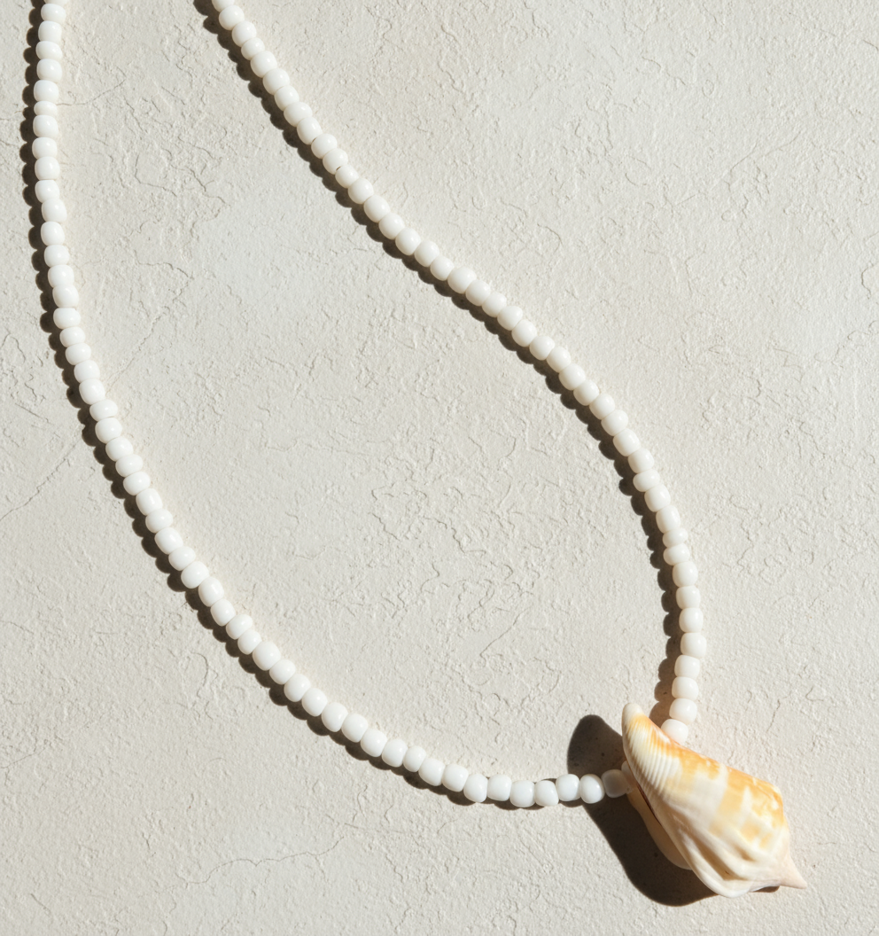 Feito por nós à mão e com carinho, este colar de missangas delicadas é uma ode à beleza simples e natural. No centro, uma concha verdadeira convida-te a fechar os olhos e a sentir a brisa suave da praia mais tranquila da tua imaginação.