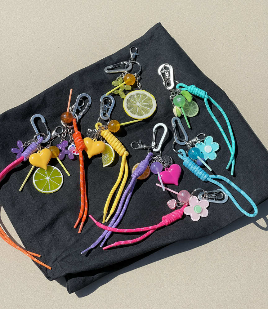 Um mix colorido e cheio de energia: fita roxa, coração cor de rosa, chupa roxo, rodela de laranja e mini Oreo. Vem com mosquetão e gancho para poderes usar na mala, tote bag, mochila ou nas tuas chaves. Um acessório que dá vida a qualquer look! 🍭